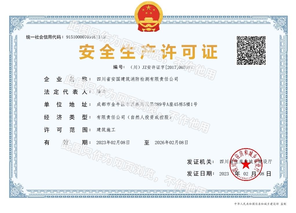 四川省安國建筑消防檢測有限責任公司,成立于1998年,經四川省公安消防總隊批準,工商部門注冊的獨立法人單位。 公司具有建筑消防設施檢測、電氣防火安全檢測、維修、保養及技術咨詢一級資質的中介技術服務機構,獲得CMA計量認證。主要業務范圍是:接受建設單位或有關單位委托,承擔新建、改建、擴建建筑自動消防設施技術檢測、電氣防火安全檢測、以及承接建筑消防設施維護保養,對已交付使用的建設消防設施的運行情況進行運行檢測,開展建筑消防設施的消防安全技術咨詢。公司設辦公室、總工辦、財務部、檢測部、維保部等職能機構,擁有一
